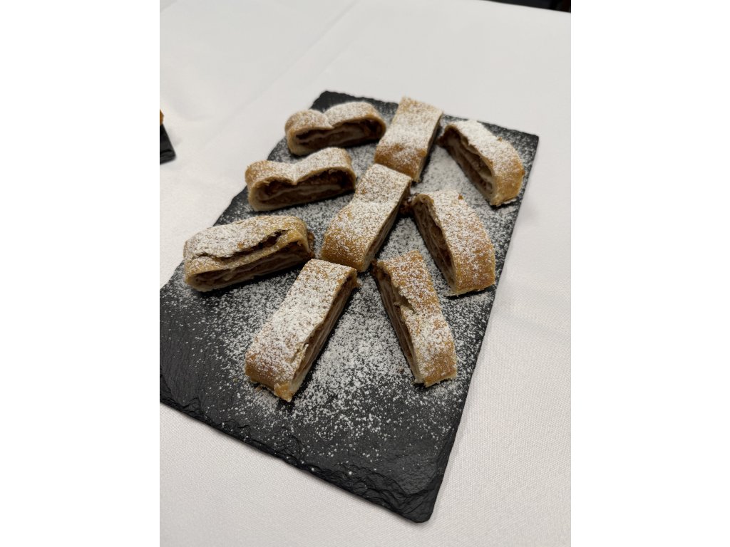 Listové těsto, jablka, skořice, vanilkový cukr, hrozinky, ořechy, cukrový posyp