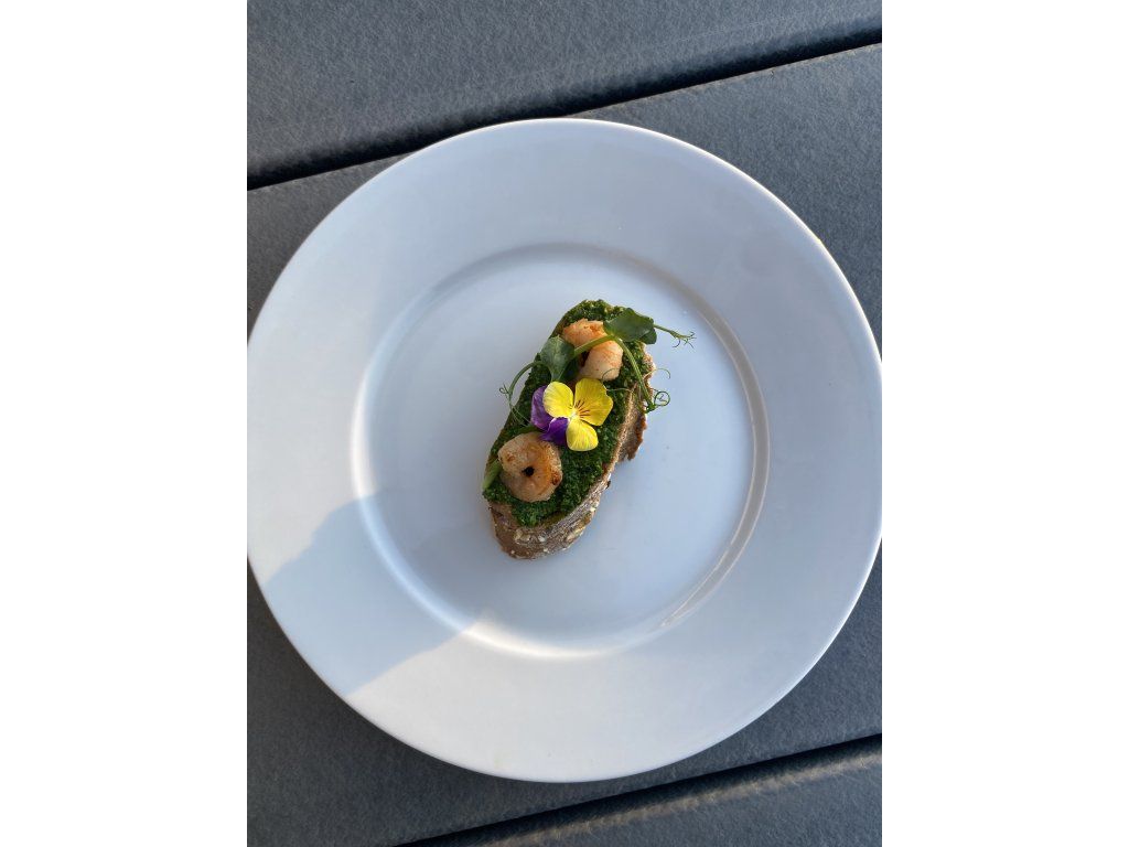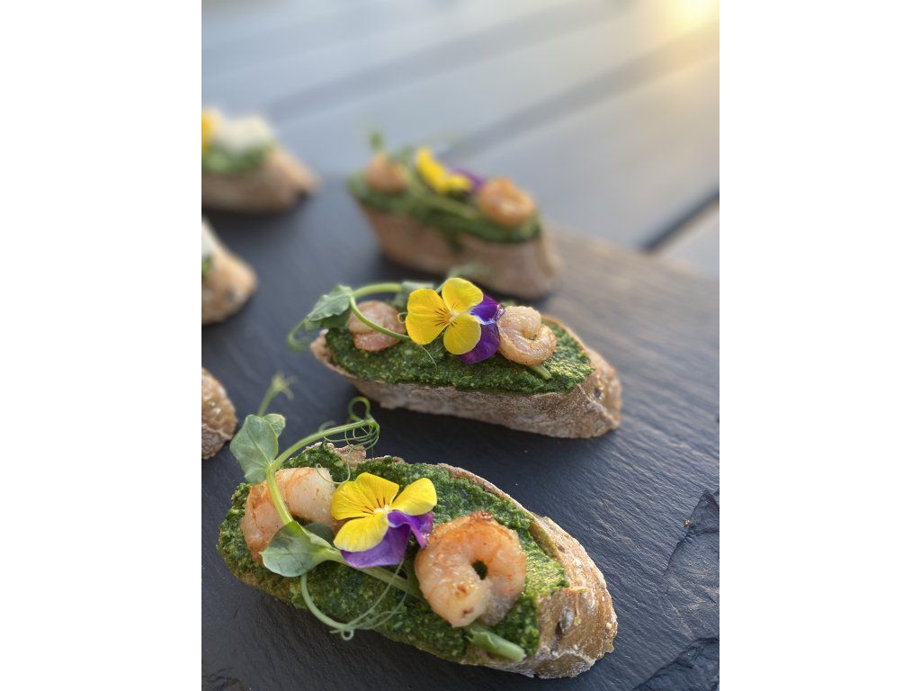 Domácí baby špenátové pesto, krevety, výhonky hrášku, kvítí