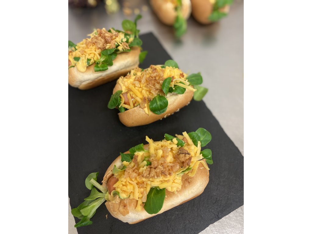 Domácí bulka, polníček, tomatový základ, mini párek, čedarová omáčka, sypaná čedar, smažená cibulka