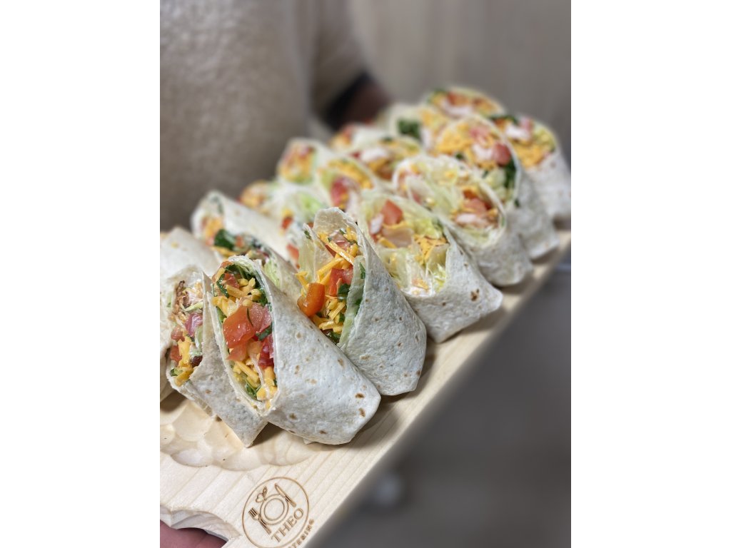 Tortilla, dip, zelenina, kuřecí stripsy z čerstvého masa, bylinky