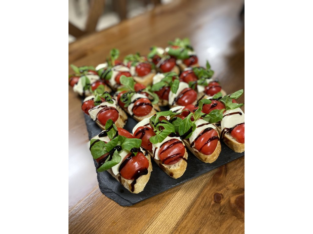 Pečivo, sýr mozzarella, balsamico, bazalka, dekorace, květiny