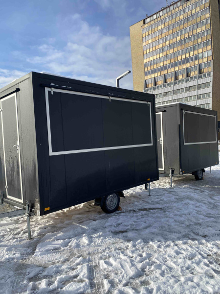 Naše food trucky jsou částečně vybavené, v elegantním černém provedení, o rozměrech 3,5 × 2 m.