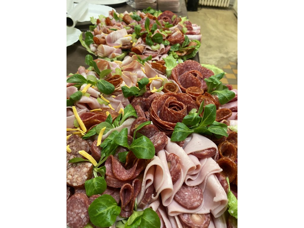 Variace různých druhů salámů, ovoce, dekorace, květiny